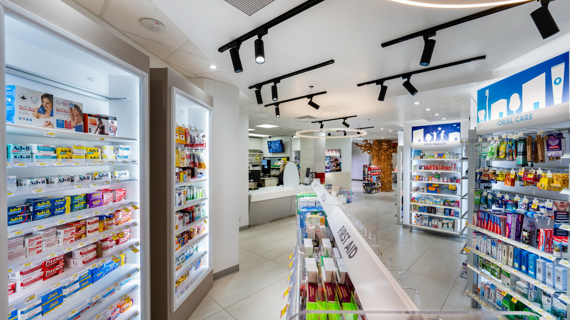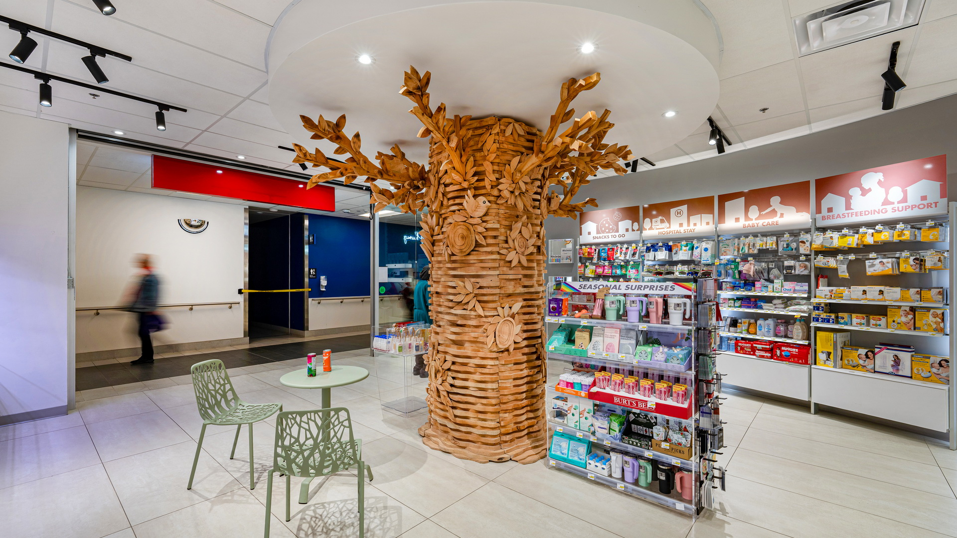 This tree became the visual and emotional centerpiece of the pharmacy, guiding orientation and softening the clinical feel of the hospital corridor.